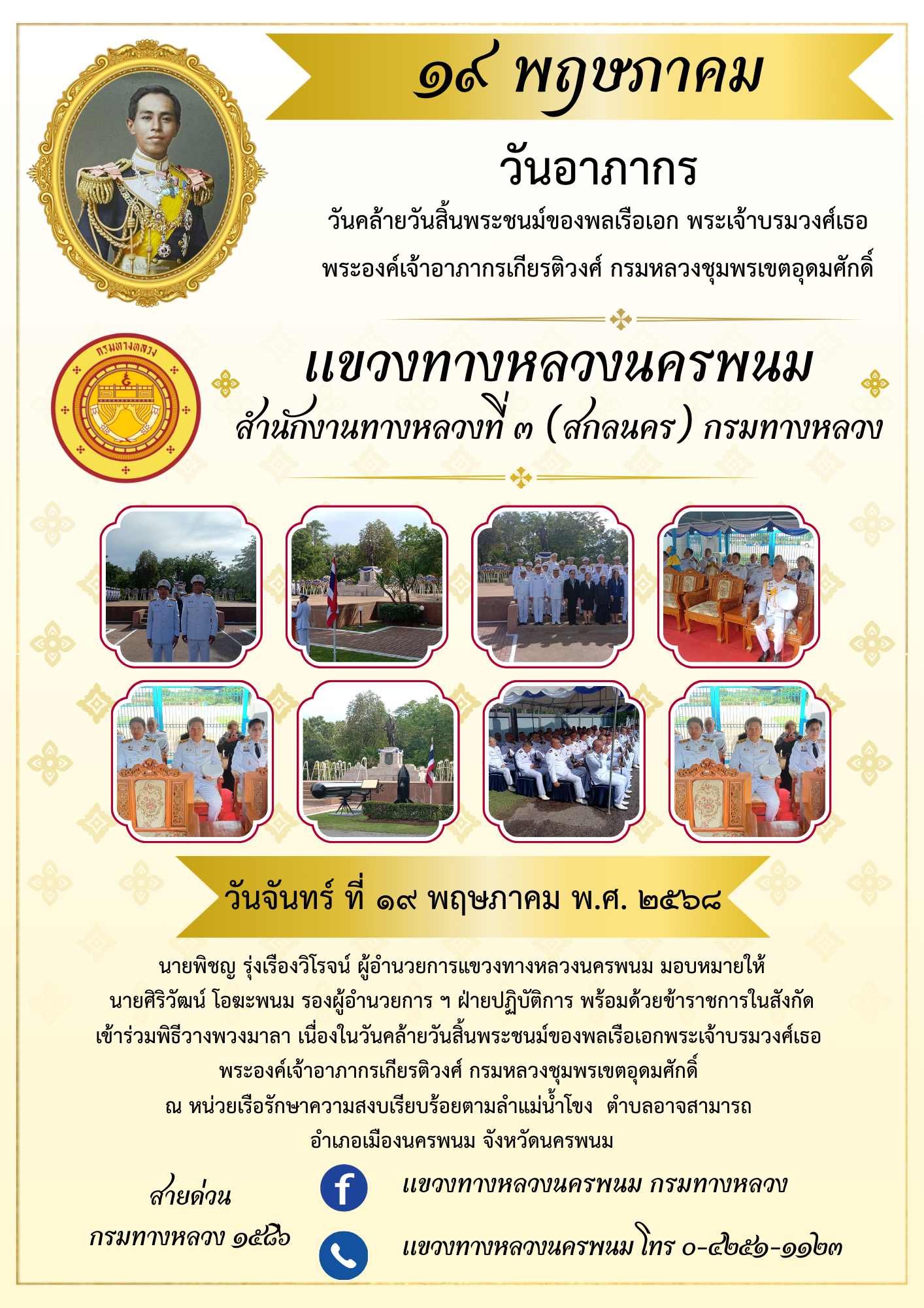 เข้าร่วมพิธีวางพวงมาลา เนื่องในวันคล้ายวันสิ้นพระชนม์ของพลเรือเอกพระเจ้าบรมวงศ์เธอ พระองค์เจ้าอาภากรเกียรติวงศ์ กรมหลวงชุมพรเขตอุดมศักดิ์