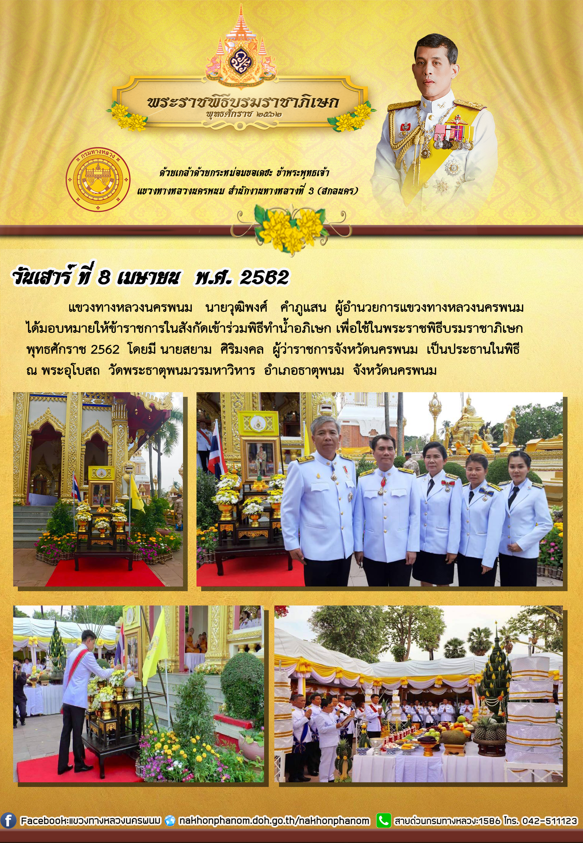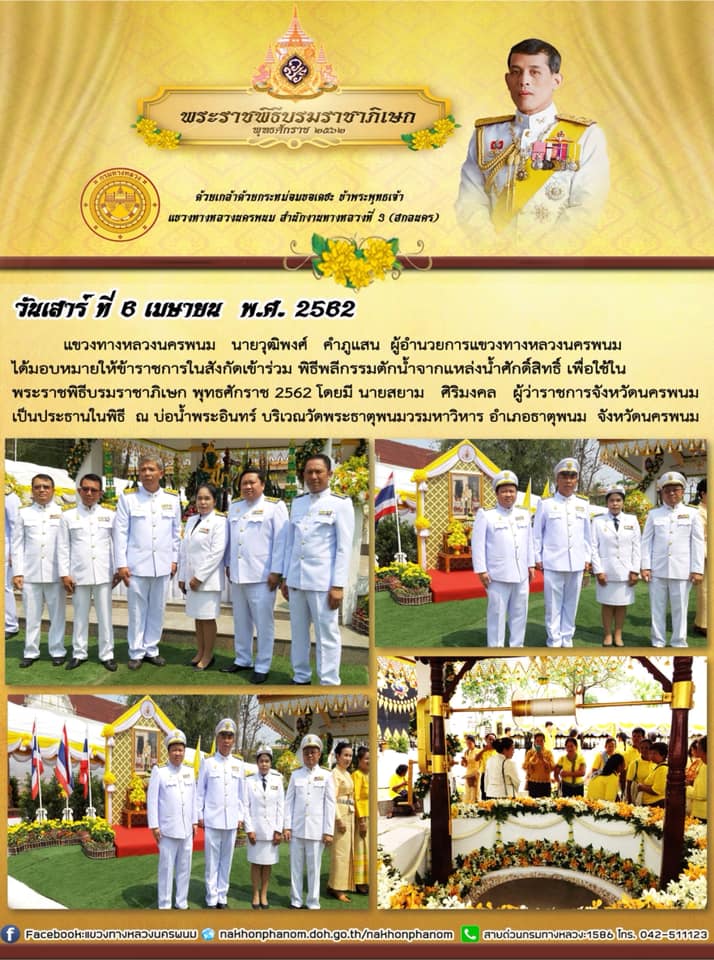 แขวงทางหลวงนครพนม นายวุฒิพงศ์ คำภูแสน ผู้อำนวยการแขวงทางหลวงนครพนม ได้มอบหมายให้ข้าราชการในสังกัดเข้าร่วมกับจังหวัดนครพนม ในพระราชพิธีบรมราชาภิเษก พุทธศักราช 2562