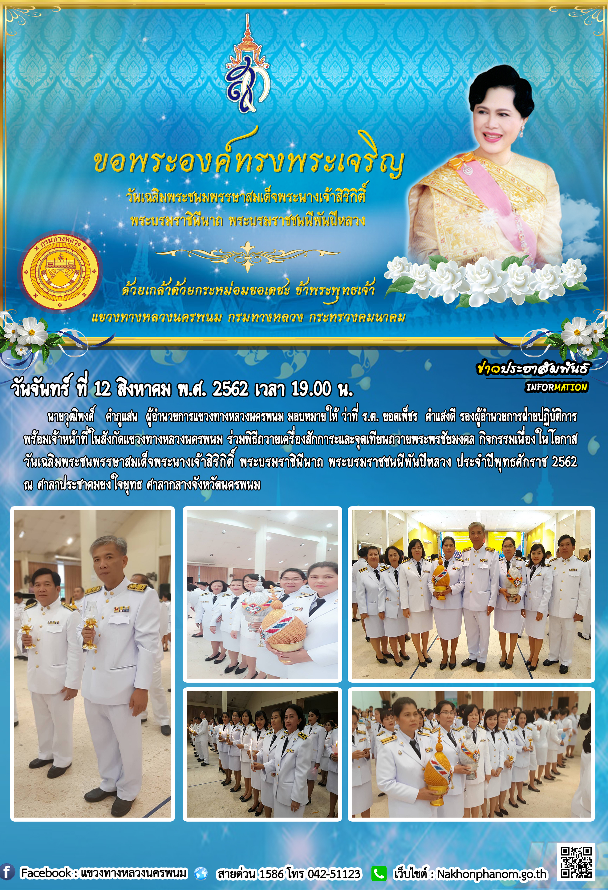 ร่วมพิธีทำบุญตักบาตรถวายเป็นพระราชกุศล กิจกรรมเนื่องในโอกาสวันเฉลิมพระชนพรรษาสมเด็จพระนางเจ้าสิริกิติ์ พระบรมราชินีนาถ พระบรมราชชนนีพันปีหลวง ประจำปีพุทธศักราช 2562 ณ วัดพระมหาธาตุ อำเภอเมือง จังหวัดนครพนม